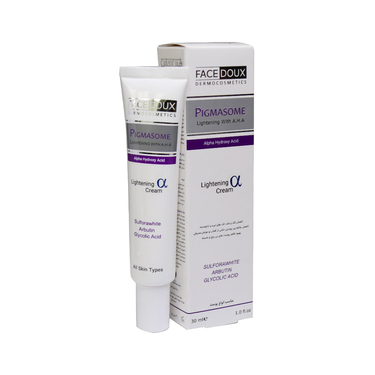 - کرم پیگمازوم فیس دوکس حاوی مواد موثره ضدلک و ضدپیری مانند آلفا آربوتین طبیعی، گلوتاتیون و ویتامین C