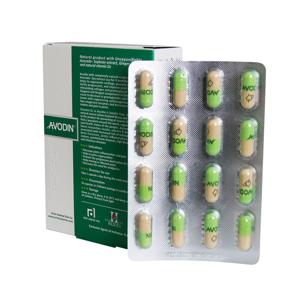 کپسول غضروف ساز حاوی عصاره موثر آووکادو و سویا و زنجبیل جهت کاهش التهاب و درد مفاصل جلوگیری از تخریب پیش رونده غضروف، و بازسازی غضروف.آوودین با منشا کاملاً طبیعی حاوی عصاره آووکادو- سویا به مدت ۳ ماه تا ۳ سال، با تحریک ساخت کلاژن و پروتئوگلیکان باعث بازسازی غضروف، کاهش سرعت پیشرفت استئوآرتریت و کاهش دردهای مفصلی می گردد. ترکیبات موجود در زنجبیل، با مهار آنزیم های سایکلواکسیژناز و لیپواکسیژناز سبب کاهش سطح پروستاگلاندین ها و لوکوتری ان ها می شوند و در نتیجه التهاب و درد را کاهش می دهند.