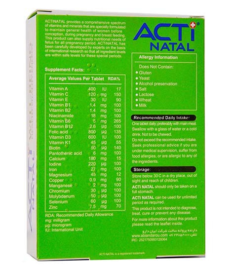 قرص قرص اکتی ناتال، یک مولتی ویتامین موثر در دوران بارداری و شیردهی می باشد که نیازهای تغذیه ای بانوان باردار و شیرده را تامین می‌کند. این محصول ترکیباتی متناسب با احتیاجات تغذیه‌ای مادر و جنین در تمام دوران بارداری دارد. تمامی خانم‌های باردار و شیرده به قرص‌های مولتی ویتامین نیاز دارند تا سلامتی بدن خود را حفظ کنند و جنین و نوزادی سالم داشته باشند.