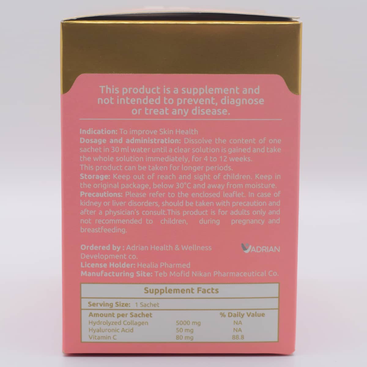 پودر کلاژن گلد ۵۰۰۰ آدریان، دارای کلاژن هیدرولیز شده (۵۰۰۰ میلی گرم)، هیالورونیک اسید (۵۰ میلی گرم) و ویتامین سی (۸۰ میلی گرم ) می باشد. ترکیبات این مکمل آدریان، کاملا اختصاصی، برای رفع چین و چروک و جلوگیری از پیری زودرس می باشد. کلاژن ۸۰% بافت پوست را تشکیل می دهد. با افزایش سن و قرار گرفتن در معرض عواملی مانند استعمال سیگار و نورخورشید، میزان آن کاهش می یابد.
