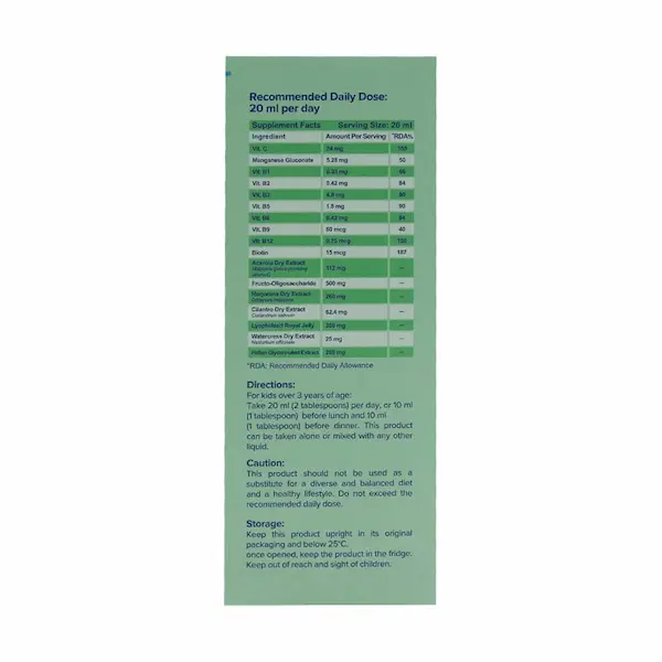 این محصول شامل مجموعهای کامل از ویتامینهای گروه B، ویتامین C، مینرالهای ضروری و عصارههای گیاهی است: