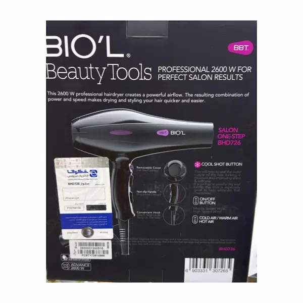 سشوار بیول مدل BHD726 یکی از قدرتمندترین و پرفروشترین مدلهای برند Biol است که با توان ۲۶۰۰ وات واقعی، فناوری یون ساز حرفهای، موتور با کیفیت، سریهای کامل و طراحی ارگونومیک، یک گزینه ایدهآل برای مصرف خانگی و سالنی محسوب میشود. اگر به دنبال سشوار بادوام، با قدرت خشککنندگی بالا و قابلیت استایلدهی حرفهای هستید، این مدل یکی از بهترین انتخابها است.