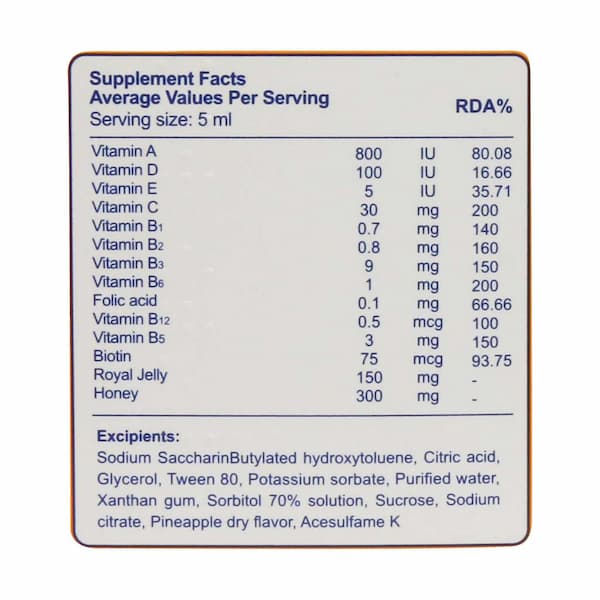 - حاوی رویال ژلی، عسل، ویتامینهای گروه ب، سی، آ، ای، د
