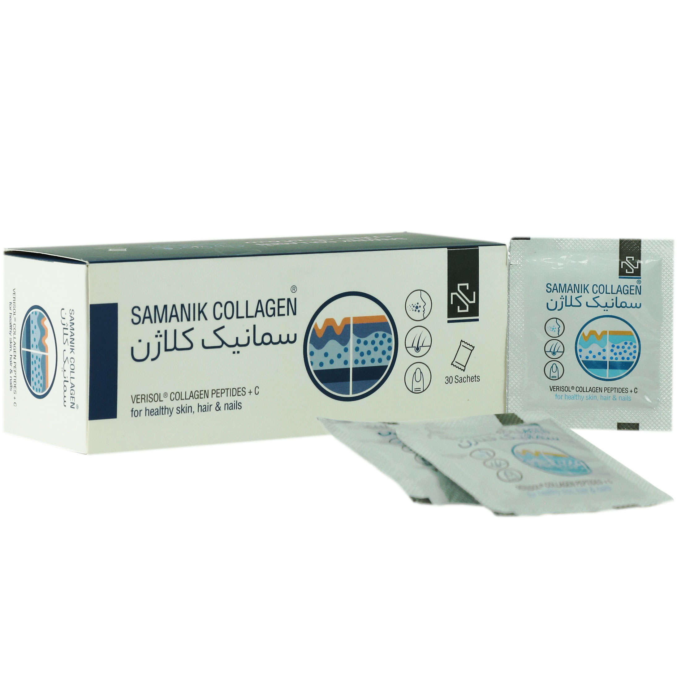 ساشه سمانیک کلاژن، حاوى ۲۵۰۰ میلى گرم کلاژن پپتید (Verisol)، ۶۶ میلى گرم ویتامین ث، ۲۳۴ میلى گرم عصاره بلوبرى می باشد. سمانیک کلاژن ترکیب خاص و ثبت اختراع شده کلاژن پپتید، محصول شرکت آلمانى Gelits تهیه شده است که شناخته شده ترین و بهترین کلاژن پپتید دنیا مى باشد. با مصرف روزانه ۲۵۰۰ میلی گرم اثرات درمانی خود را بروز می دهد که این اثرات درمانی توسط مطالعات بالینی متعدد اثبات گشته است. ترکیب خاص و ثبت اختراع شده قبیل کاهش خاصیت کشسانی و استحکام پوست، افزایش چین و چروک و سلولیت پوستی و همچنین نازک و شکننده بودن مو و ناخن را برطرف می نماید. عصاره بلوبری دارای خاصیت آنتی اکسیدانی و محافظت از پوست می باشد و وجود آن در فرمولاسیون سمانیک کلاژن، در کنار خواص داروئی، طعم دلپذیر برای ایجاد حس خوشایند مصرف کننده ایجاد می کند. ویتامین ث، گزارش های علمی نشان داده که سطح ویتامین ث در پوست پیر یا آسیب دیده از نور کمتر، کمتر از افراد سالم است. کمبود ویتامین ث، موجب از بین رفتن تعدادی از عملکردهای مهم پوست می شود. التیام ضعیف زخم، ضخیم شدن لایه شاخی و خونریزی زیر جلدی، در افراد با کمبود ویتامین ث با شدت بیشتری شروع می شود. ویتامین ث یک آنتی اکسیدان قوی است.
